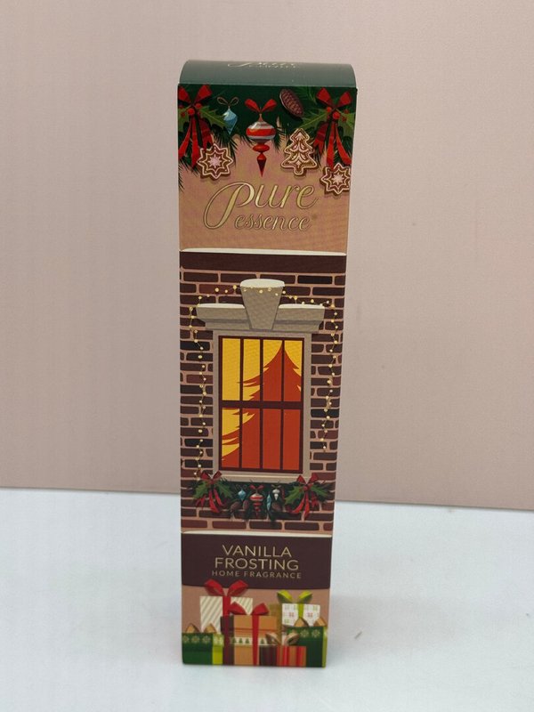 Este es un difusor de fragancia para el hogar Pure Essence Vanilla Frosting.Aroma: Ofrece una fragancia de vainilla cálida y relajante diseñada para evocar sensaciones de comodidad y bienestar en el hogar.Uso: Se utiliza para perfumar habitaciones, baños, dormitorios o cualquier espacio donde se desee añadir un aroma agradable.Formato: Es probable que se trate de un difusor de varillas o un ambientador en spray, diseñado para una difusión continua y sencilla de la fragancia.Presentación: El empaque presenta una temática de navidad