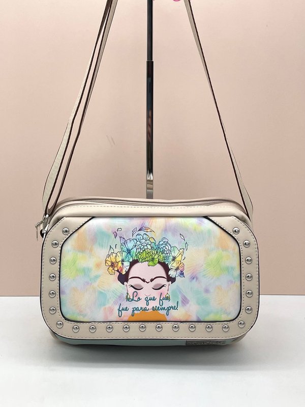 La bandolera "FUE" de Frida Kahlo es el complemento perfecto para cualquier ocasión. Con herrajes metálicos y un diseño de 25x18x7 cm, esta bandolera destaca po