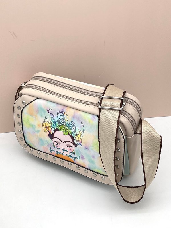 La bandolera "FUE" de Frida Kahlo es el complemento perfecto para cualquier ocasión. Con herrajes metálicos y un diseño de 25x18x7 cm, esta bandolera destaca por su exterior de PU y forro de poliéster. Ya sea para un día de compras o una noche en la ciudad, esta bandolera te acompañará con estilo y funcionalidad. ¡Hazte con la tuya y lleva contigo un pedacito del arte y la historia de Frida Kahlo!