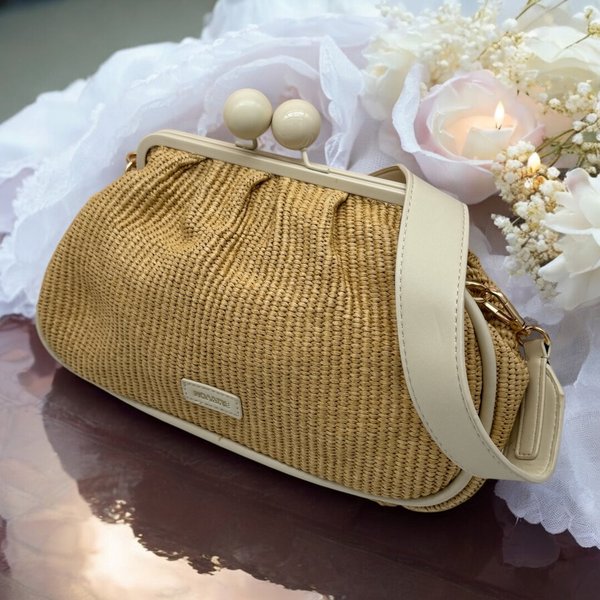 Eleva tu outfit con el Bolso Con BROCHE KISS LOCK punto de arroz, la definición perfecta de versatilidad y elegancia. Este bolso ha sido diseñado para ser el protagonista de tu armario.