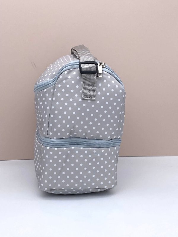 Eleva tu outfit con el Bolso Nevera Lunares Gris, la definición perfecta de versatilidad y elegancia. Este bolso ha sido diseñado para ser el protagonista de tu armario.