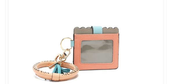 Exterior de cuero veganoHerrajes doradosDiámetro de la pulsera: 10 cm (1.27 cm de ancho)Mosquetón metálico para llavesEl color de la borla varía según la impresión.Cartera de tarjeta:Solapa plegable con cierre de botón a presiónBolsillo deslizante y ranura para tarjetas.Ventana de identificación en la parte posteriorTamaño: 11 cm x .8 cm x 10 cm