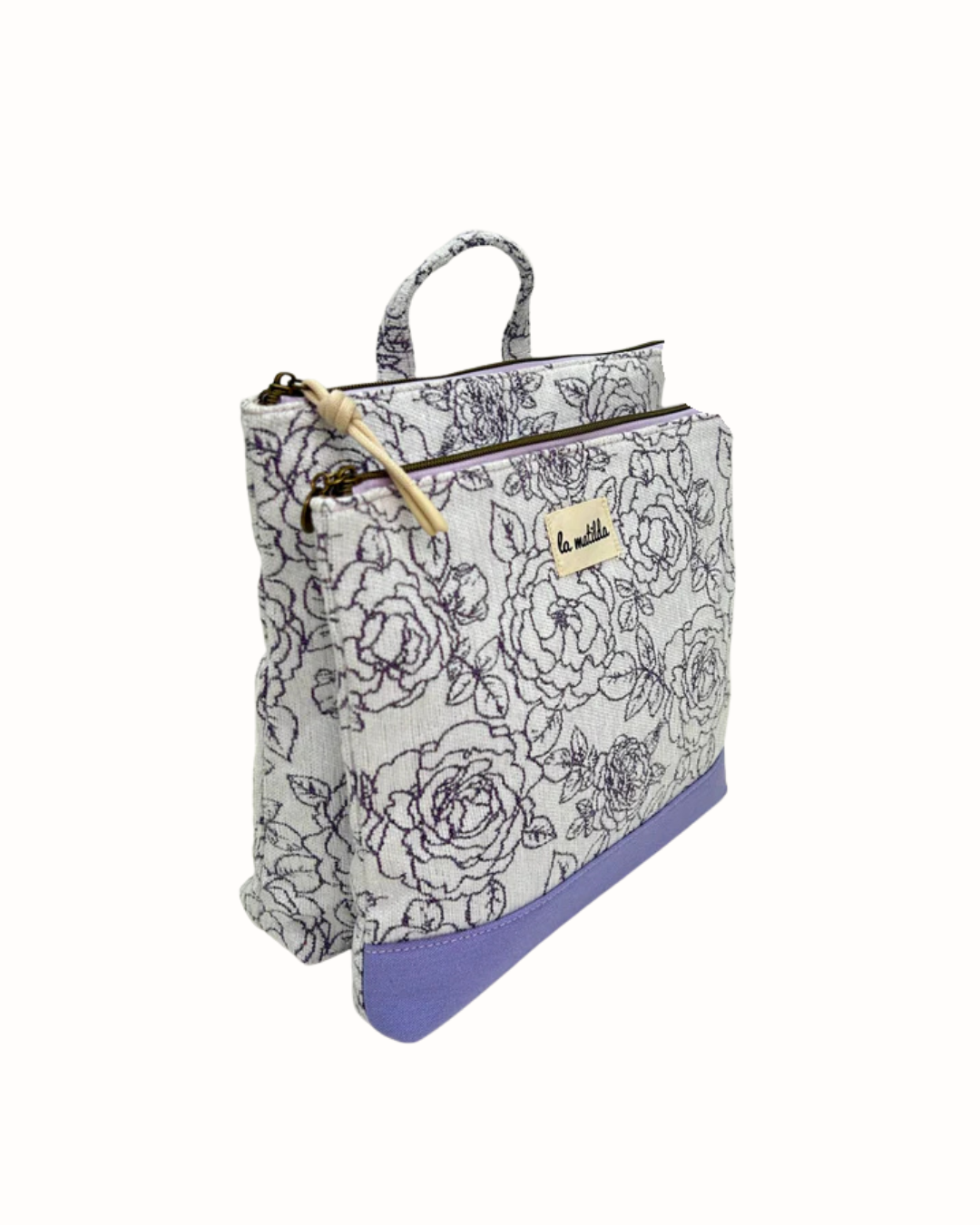 Su estampado de rosas en trazo violeta sobre fondo crudo aporta un aire casual y femenino, mientras que su estructura de doble compartimento te permite organizar tu día a día con total eficacia.
