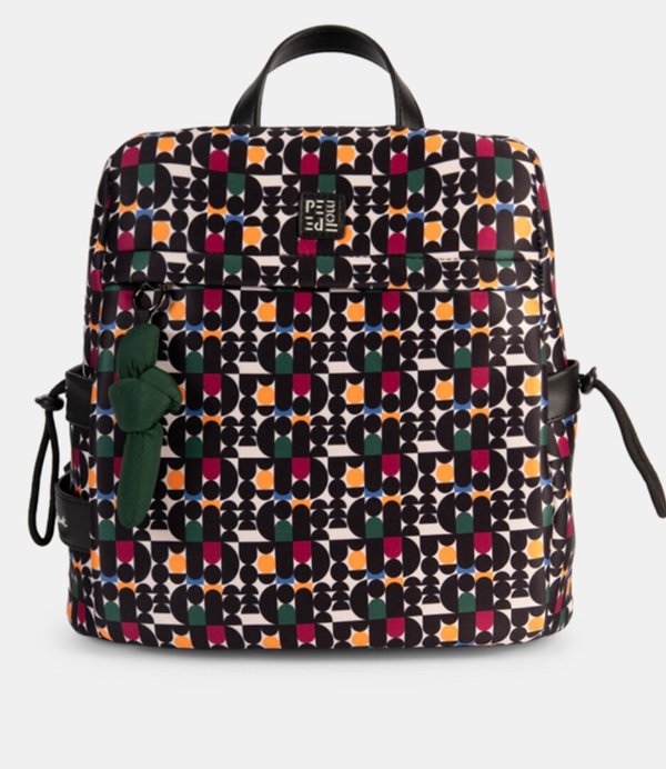 Una mochila que no solo es práctica, sino que también tiene mucho que decir. Su estampado gráfico tipo retro le da un aire artístico y vibrante, ideal para quienes buscan un complemento con personalidad para su día a día. Comodidad, estilo y organización en una sola pieza. Estampado geométrico de inspiración retro Diseño estructurado y tamaño ideal para el día a día Asa superior + correas ajustables con logo Bolsillos exteriores y compartimentos funcionales Interior amplio y bien compartimentadoMedidas:Alto: 31 cmAncho: 31 cmFondo: 13 cmCombina el diseño estructurado con una estética gráfica de gran impacto. Su estampado geométrico tipo retro convierte este accesorio en una declaración de estilo, perfecta para quienes valoran tanto el diseño como la funcionalidad.Está pensada para adaptarse a tu rutina, gracias a su formato práctico, su asa superior y sus correas ajustables con el logo de la marca. Incluye bolsillos laterales con elástico para objetos de acceso rápido, un bolsillo frontal con cremallera y un adorno decorativo colgante que refuerza su carácter único.En el interior, ofrece varios compartimentos y bolsillos, todos forrados con el estampado icónico de la marca, lo que asegura una organización perfecta sin perder estilo.Peta VeganNuestros bolsos han sido aprobados como veganos por la asociación internacional PETA dedicada a la protección de los animales y a promover el respeto por los mismos. Este bolso no utiliza materiales de origen animal, han sido aprobados como cruelty free y veganos.